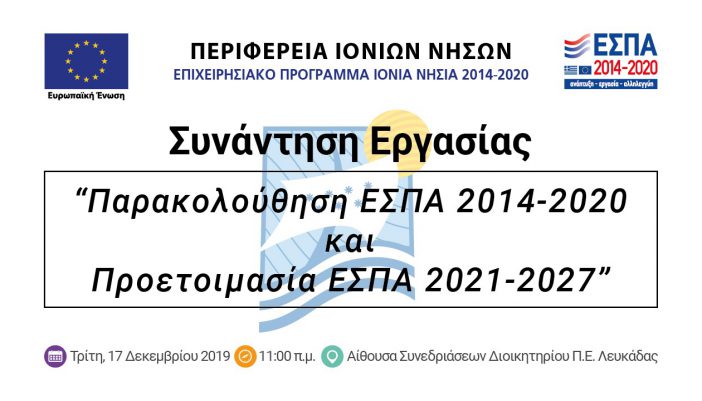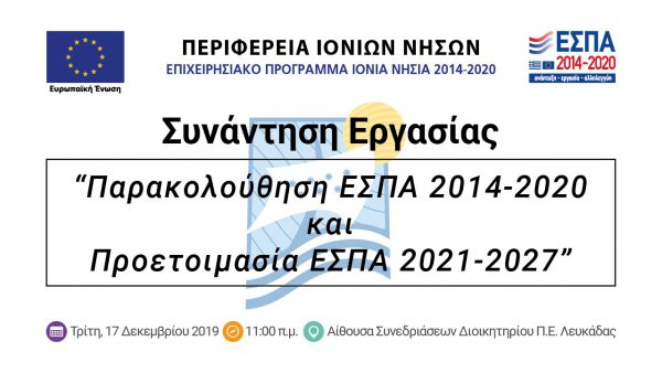 Ανοικτή συνάντηση εργασίας με θέμα το τρέχον και το επόμενο ΕΣΠΑ, θα πραγματοποιηθεί την ερχόμενη Τρίτη, 17 Δεκεμβρίου 2019, και ώρα 11:00 π.μ., στην Αίθουσα Συνεδριάσεων του Διοικητηρίου της Π.Ε. Λευκάδας (Αντ. Τζεβελέκη & Υπ. Αθ. Κατωπόδη, Λευκάδα).