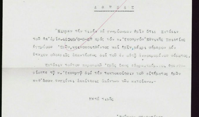 Έχομεν την τιμήν να γνωρίσωμεν υμίν ότι: Κατόπιν του υπ’ αρίθ. 48148/8-8-59 προς τον κ.Υπουργόν Εθνικής Παιδείας εγγράφου ημών, κοινοποιηθέντος και υμίν, μέχρι σήμερον δεν έτυχον ουδεμίας απαντήσεως δια του εν αυτή αναφερομένου θέματος.