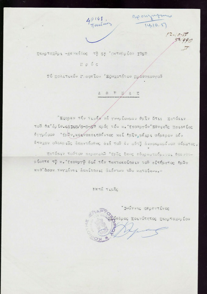 Επιστολή του 1959 από την Κοινότητα Σπαρτοχωρίου προς τον Πρωθυπουργό