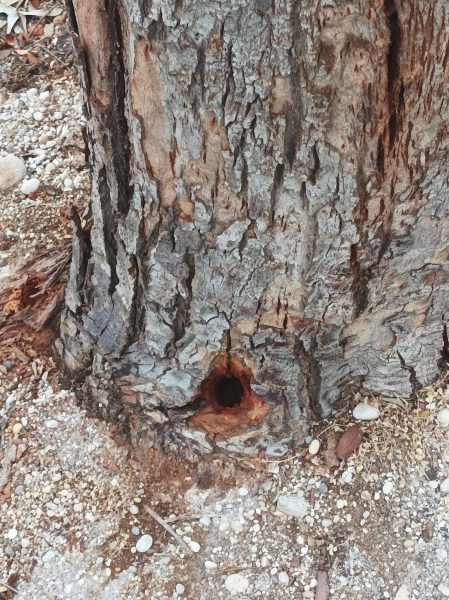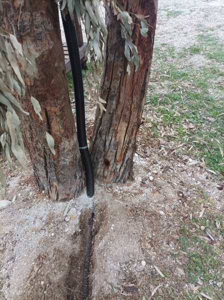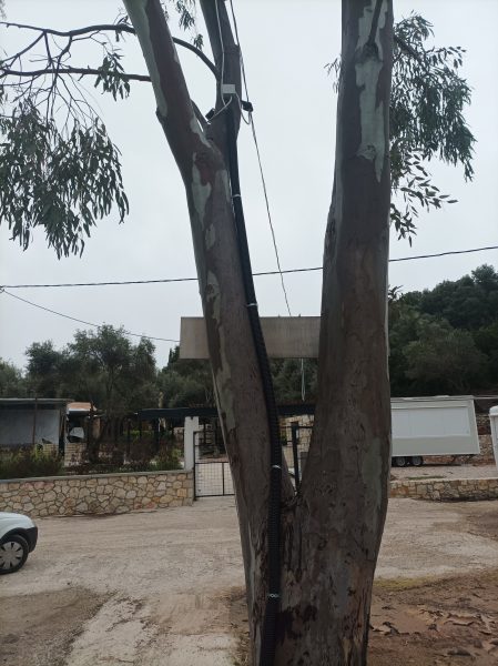 Μετά τις καταγγελίες για προσπάθεια ξήρανσης ευκάλυπτου στην τοποθεσία Φανάρι, πραγματοποίησα αυτοψία και διαπίστωσα ότι εκτός από την προσπάθεια ξήρανσης έχουν γίνει και παράνομες εργασίες τοποθέτησης υπογείου καλωδίου ηλεκτρισμού, τοποθέτησης εναερίου καλωδίου ηλεκτρικής εγκατάστασης καθώς και τοποθέτηση φωτιστικών σωμάτων, καλωδίων και στους δύο ευκάλυπτους.