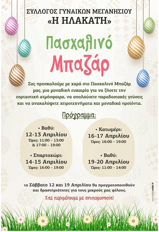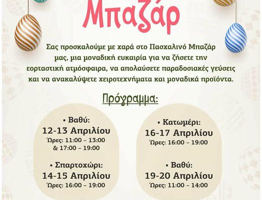 9 Απρ 2025 Ανακοινώσεις/Δ.Τύπου, Δραστηριότητες/Εκδηλώσεις, Ιστορία/Παράδοση 0 Πασχαλινό μπαζάρ του Συλλόγου Γυναικών Παναγιώτης Κονιδάρης