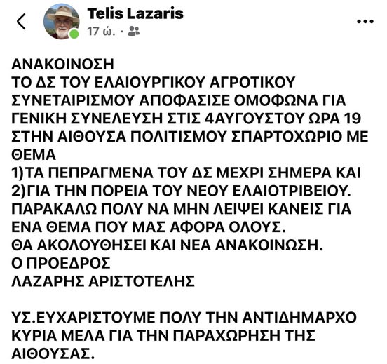 28 Ιούλ 2025 Ανακοινώσεις/Δ.Τύπου 0 Ανακοίνωση Ελαιουργικού Συνεταιρισμού για ΓΣ Παναγιώτης Κονιδάρης