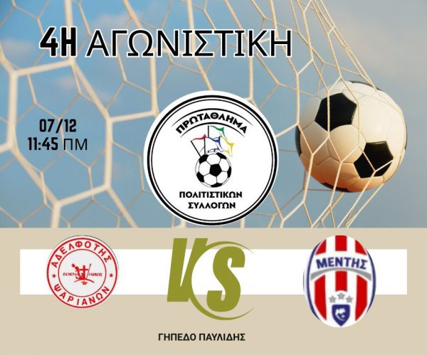 Την Κυριακή 7 Δεκεμβρίου 2025 συνεχίζεται το 3ο Πρωτάθλημα Πολιτιστικών Συλλόγων Αττικής με τον αγώνα Αδελφότητα Ψαριανών – Μέντης Μεγανησίου . Φίλες και Φίλοι των Συλλόγων μας δίνουμε όλοι το παρόν να ενισχύσουμε τις ομάδες μας και την προσπάθεια των παιδιών μας. Μεγανησιώτες δίνουμε και εμείς δυναμική παρουσία να εμψυχώσουμε την ομάδας μας για να πραγματοποιήσει την πρώτη της νίκη στις 11:45 στο Γήπεδο «Χάρης Παυλίδης» (‘Αγιαξ Ταύρου)