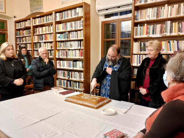 Ο Πανοσιολογιότατος Αρχιμανδρίτης π. Ιωαννίκιος, ως εκπρόσωπος της τοπικής Εκκλησίας και του Σεβασμιωτάτου Μητροπολίτου Λευκάδας και Ιθάκης κ. Θεόφιλου και Πρόεδρος του Εφορευτικού Συμβουλίου της Βιβλιοθήκης ευλόγησε την πίτα και ευχήθηκε για την καινούρια χρονιά.